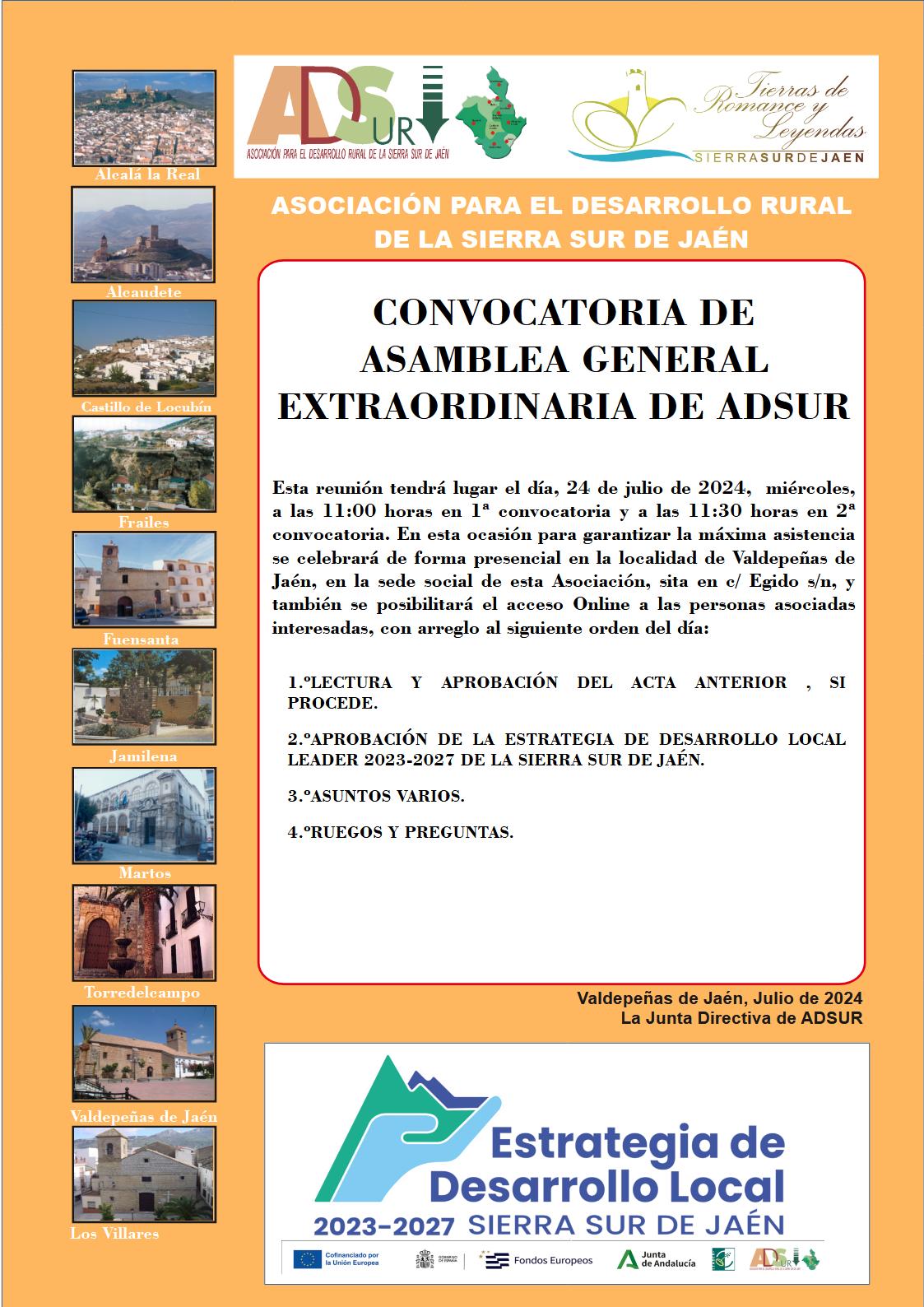 Esta reunión tendrá lugar el día, 24 de julio de 2024, miércoles, a las 11:00 horas en 1ª convocatoria y a las 11:30 horas en 2ª convocatoria. En esta ocasión para garantizar la máxima asistencia se celebrará de forma presencial en la localidad de Valdepeñas de Jaén, en la sede social de esta Asociación, sita en c/ Egido s/n, y también se posibilitará el acceso online a las personas asociadas interesadas, con arreglo al siguiente orden del día: