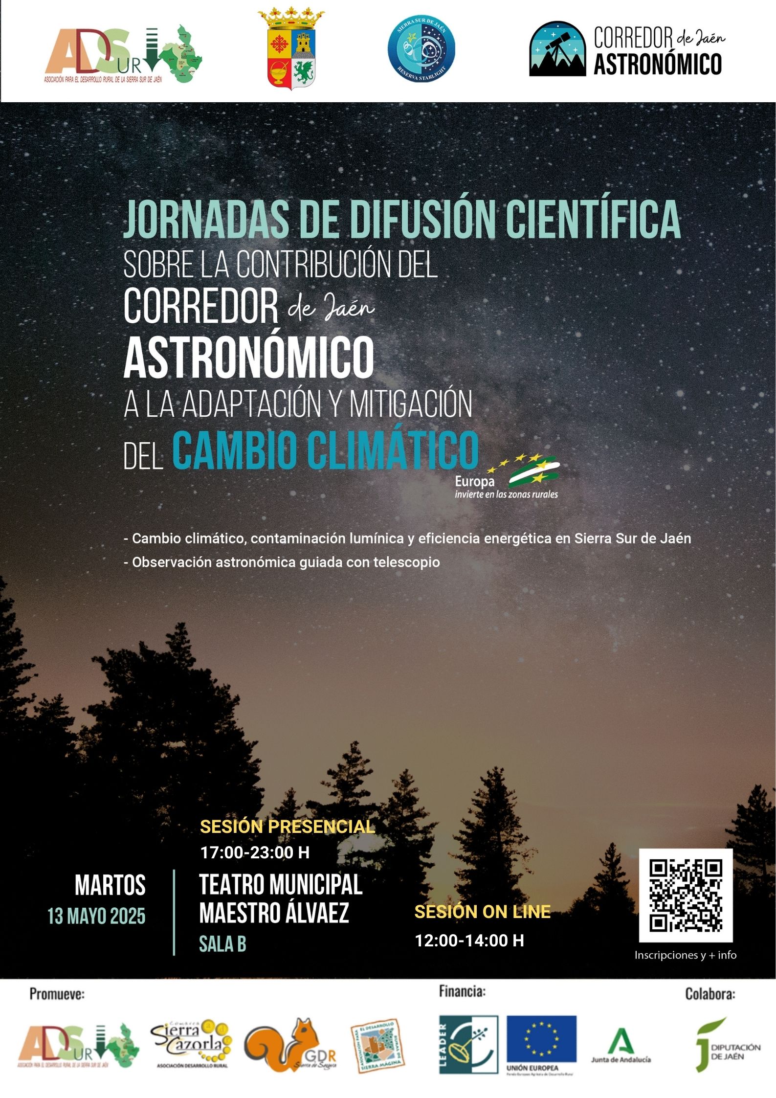 - 17:00–19:00 h – Presentación de proyectos realizados por los Ayuntamientos de la Sierra Sur de Jaén en materia de reducción de la contaminación lumínica y mejora de eficiencia energética.