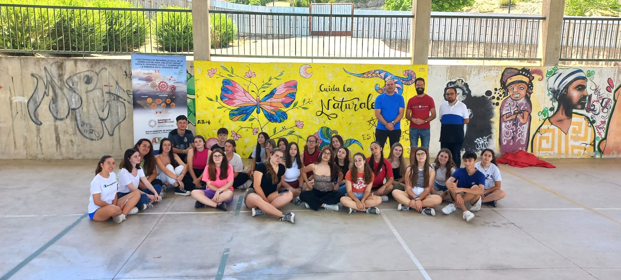 Durante varios días y por tandas fueron pintando y dando color a este muro del polideportivo con un mensaje que hablaba sobre la importancia de cuidar la naturaleza y aprender de su diversidad. La mariposa está diseñada con un ala de cada forma y eso nos sirvió para poner de relieve que las personas somos diferentes unas de otras y hay que aceptar esas diferencias y respetarlas. De esta manera a través de la creación artísticas aprendemos valores y trabajamos en equipo para crear una obra que perdurará en el centro con su mensaje.